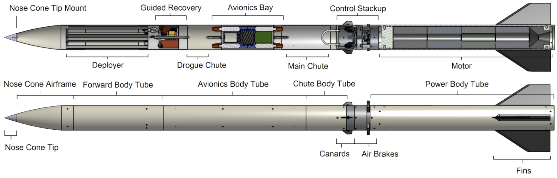 As a member of the Structures subteam, I was responsible for structural components from tip to tail, including the airframe, bulkheads, and fins. I designed the motor retainer and fin mounts in Onshape and maintained the master assembly of the rocket. This entailed making changes to components as necessary and coordinating the integration of over 100 total parts. I also performed wet and pre-preg composite layups for body tubes and couplers, as well as gained experience fabricating forged carbon components.
